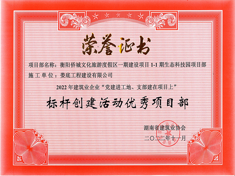 2022年衡陽僑城文化旅游度假區(qū)一期生態(tài)科技園項目標桿創(chuàng)建活動優(yōu)秀項目部榮譽證書