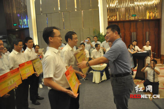 (湖南省住房和城鄉(xiāng)建設(shè)廳副廳長(zhǎng)姚英杰為第一名張家界代表隊(duì)頒獎(jiǎng)。)