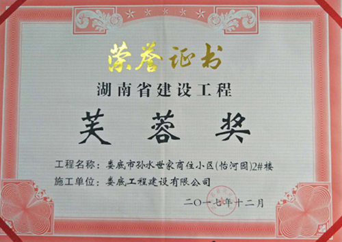 2018年1月19日,由湖南省建筑業(yè)協(xié)會(huì)舉辦的湖南省建設(shè)工程芙蓉獎(jiǎng)?lì)C獎(jiǎng)會(huì)暨精品工程經(jīng)驗(yàn)交流會(huì)在長(zhǎng)沙舉行。我司承建的婁底市孫水世家商住小區(qū)(怡河園)2#樓獲得湖南省建設(shè)工程質(zhì)量最高獎(jiǎng)—“芙蓉獎(jiǎng)”殊榮。這是我司自市農(nóng)業(yè)銀行綜合樓、市委市人民政府辦公樓1#、6#、7#、雙峰縣體育中心體育館喜獲“芙蓉獎(jiǎng)”后,第四次獲得“芙蓉獎(jiǎng)”殊榮。
