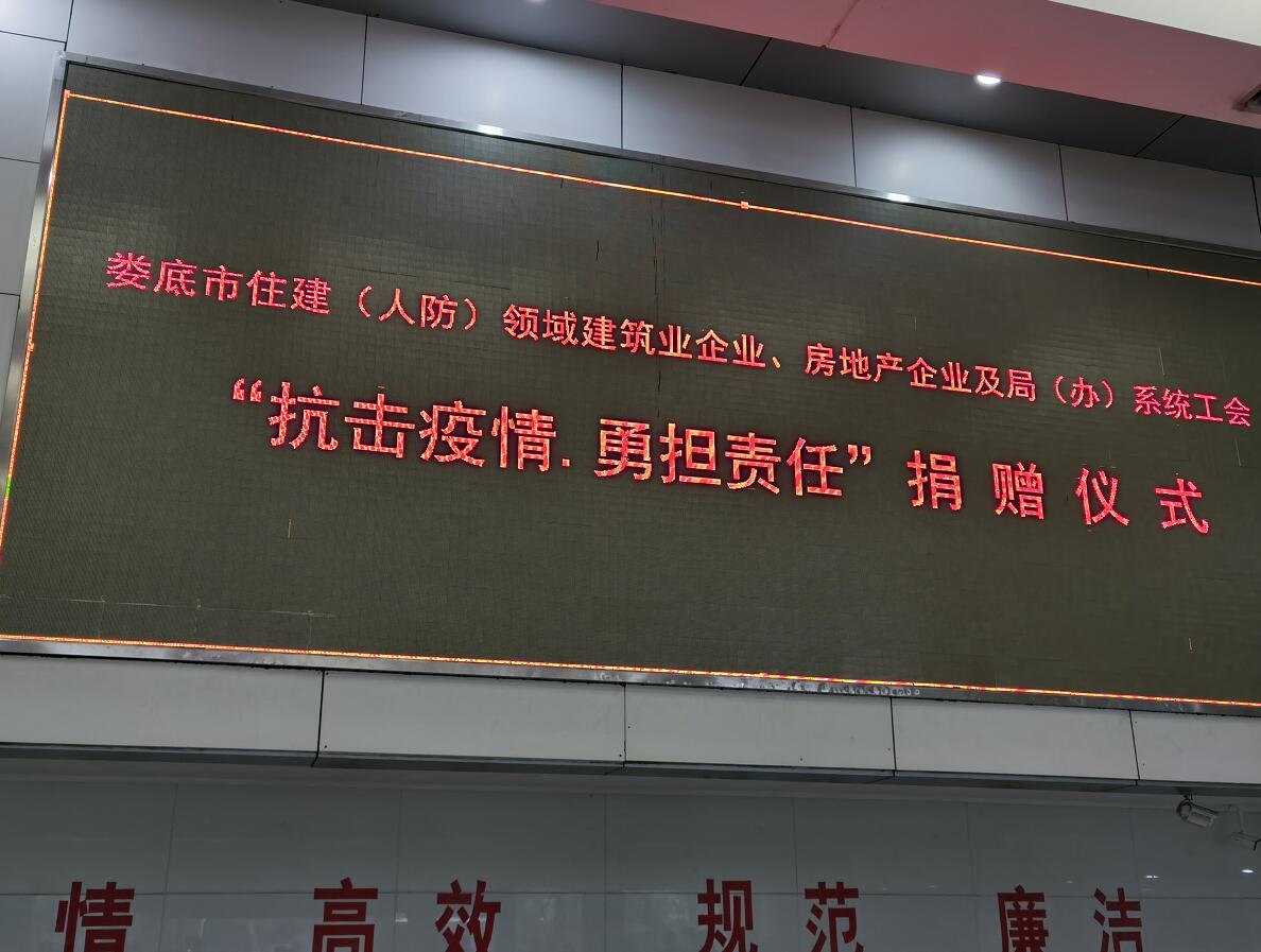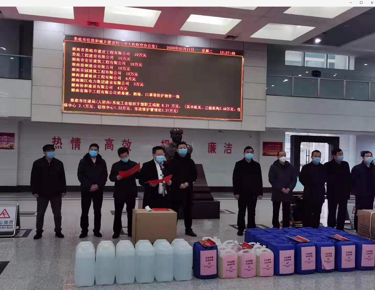 “病毒無情人有情”、“一方有難八方支援”!2020年2月11日,在婁底市住建局(人防辦)組織的市住建(人防)領(lǐng)域建筑業(yè)企業(yè)、房地產(chǎn)企業(yè)及局(辦)系統(tǒng)工會(huì)“抗擊疫情,勇?lián)?zé)任”捐贈(zèng)儀式上,公司總經(jīng)理、法人代表胡勁代表婁底工程建設(shè)有限公司捐贈(zèng)人民幣10萬元,為抗擊新冠病毒肺炎疫情盡企業(yè)的一份社會(huì)責(zé)任。公司董事長(zhǎng)張愛慧參加了捐贈(zèng)儀式。